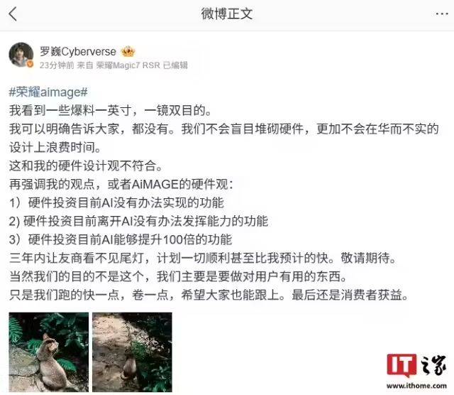 尽管已有多次爆料显示荣耀 Magic8 系列有望搭载定制 1 英寸,但其首席影像工程师罗巍曾明确表示没有“一英寸”等配置,不会盲目堆砌硬件。