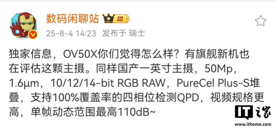 而 IT 之家小编发现,微博博主在今天(8 月 4 日)爆料称,有旗舰新机评估 OV50X 国产一英寸主摄,单帧动态范围最高 110dB。