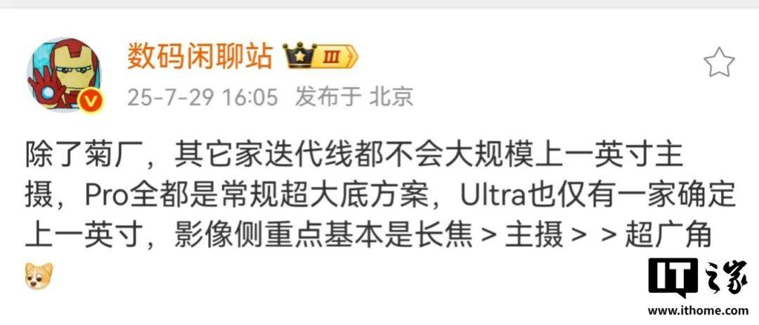 “除了菊厂,其它家迭代线都不会大规模上一英寸主摄,Pro 全都是常规超大底方案,Ultra 也仅有一家确定上一英寸,影像侧重点基本是长焦>主摄>超广角”。
