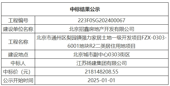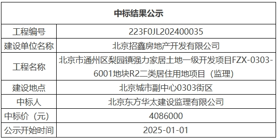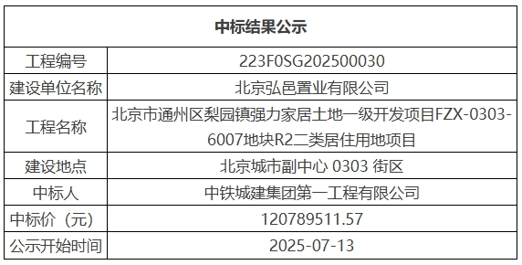 相关网站此前还发布了“北京市通州区梨园镇强力家居土地一级开发项目FZX-0303-6001地块R2二类居住用地项目”多个中标公告。