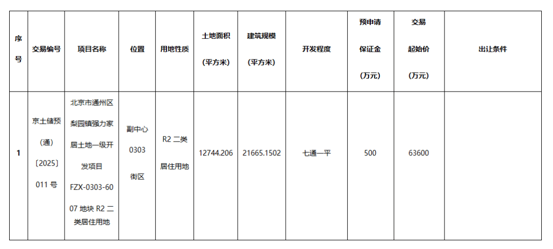 据此前公告显示,北京城市副中心 0303 街区FZX-0303-6007 地块,位于通州区九棵树街道,城市副中心西南部,东六环内,属于城市副中心03组团03街区。总用地面积约1.27公顷,规划用地性质为二类城镇住宅用地,建筑面积约2.16万平方米,建筑高度为45米。