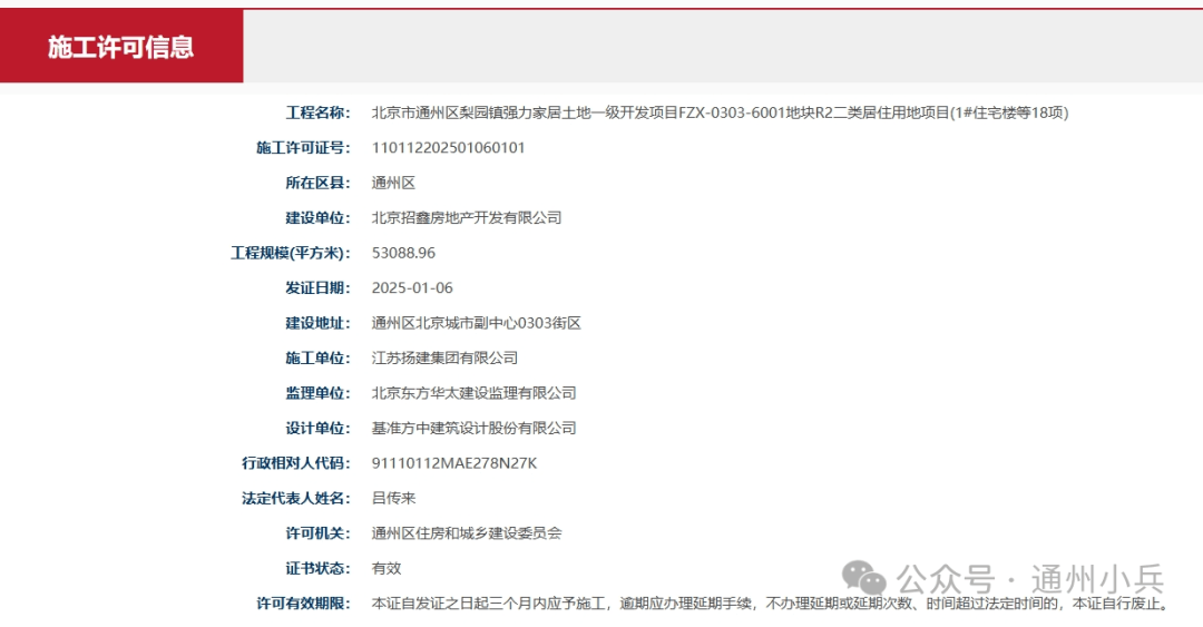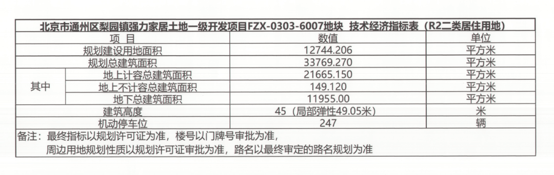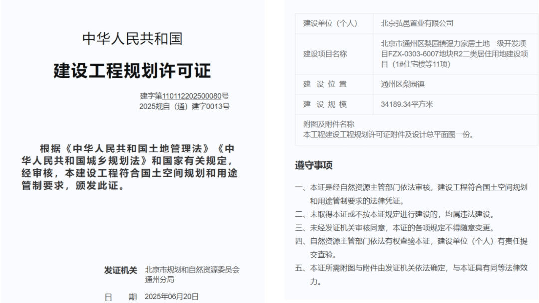 市规划自然委也发布了“北京市通州区梨园镇强力家居土地一级开发项目FZX-0303-6007地块R2二类居住用地建设项目(1#住宅楼等11项)建设工程规划许可证”。